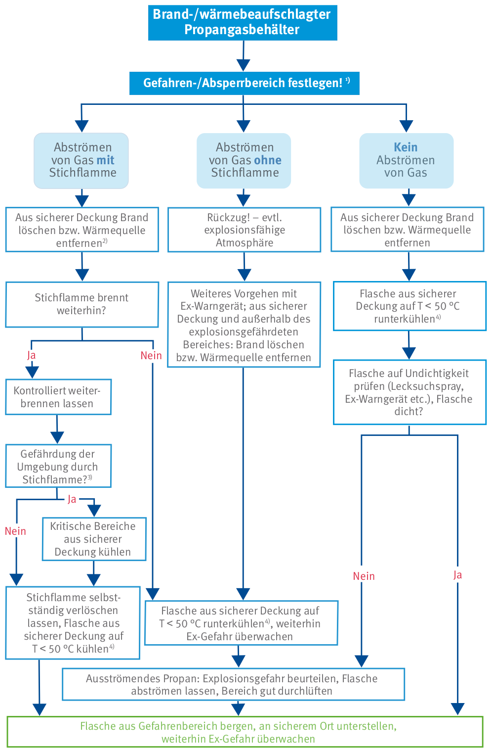 Fließschema entnommen aus DGUV Information 205-030: „Umgang mit ortsbeweglichen Flüssiggasflaschen im Brandeinsatz“, Deutsche Gesetzliche Unfallversicherung e.V., Berlin 2018