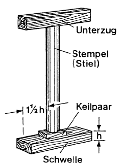 - Schwelle und Unterzug müssen beidseitig mindestens 1 ½ Holzstärke über die Stütze hinausragen