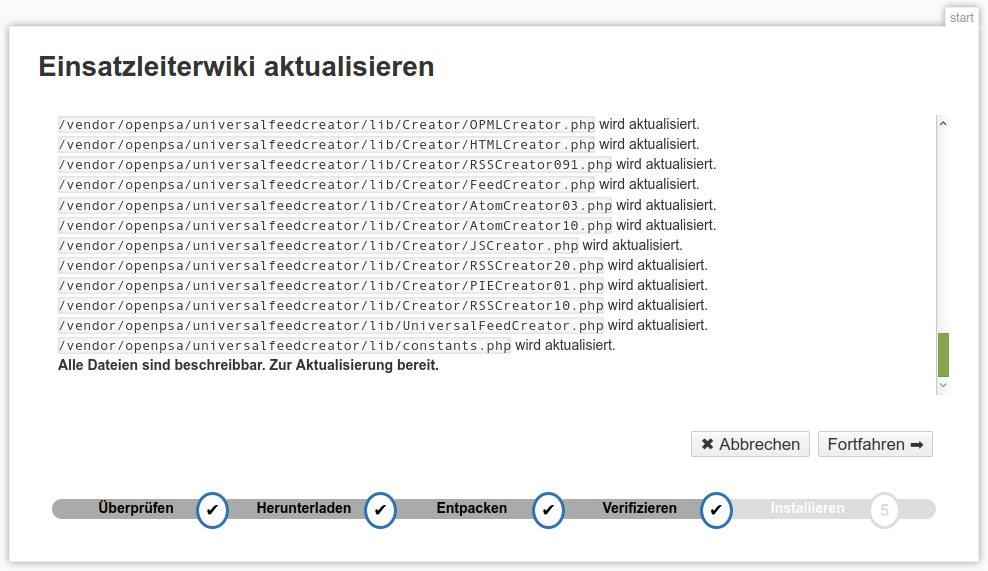 Nun wird überprüft, ob die neue Version des Einsatzleiterwikis in das Verzeichnis geschrieben werden kann bzw. ob bereits vorhandene Dateien überschreibbar sind. Bestätigen Sie wieder mit Fortfahren.