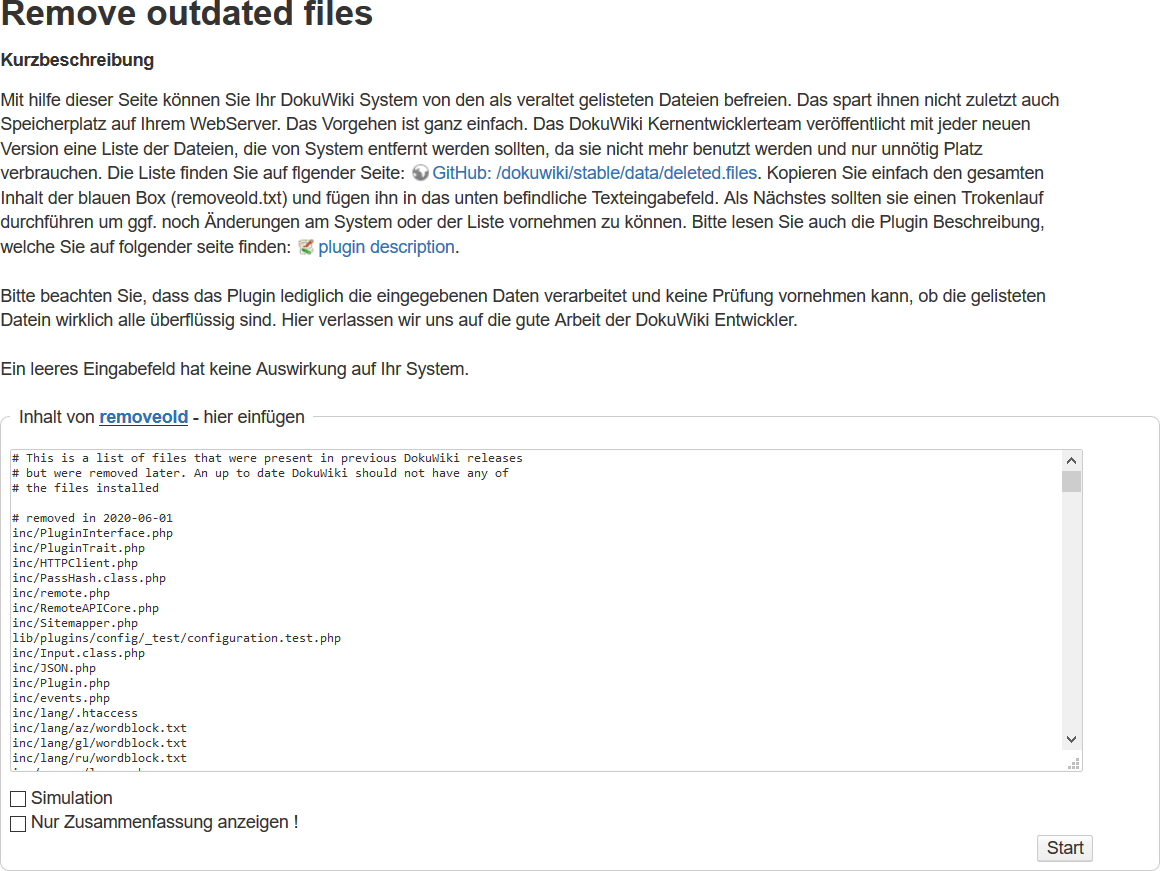 Öffnen Sie nun den Admin-Bereich und wählen Sie nun den Punkt Remove outdated files im Bereich Weitere Plugins.