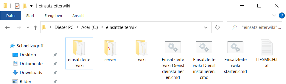 Wechseln Sie nach der Deinstallation wieder zum Ordner Ihres neuen Einsatzleiterwikis. Führen Sie die Datei Einsatzleiterwiki starten.cmd aus, um das Wiki zu starten.