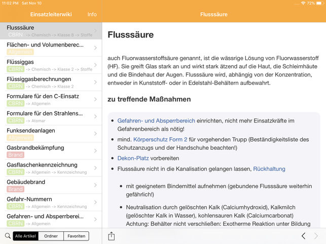 Wie Sie möglicherweise im Artikel Das Einsatzleiterwiki offline auf mobilen Geräten - ein Erfahrungs- und Statusbericht bereits gelesen haben, ist es technisch kaum umsetzbar das Einsatzleiterwiki in seiner eigentlichen Form, also als Wiki-System, offline auf iOS-Systemen zu betreiben. Daran hat sich aktuell immer noch nichts geändert. Für die hier vorgestellte App erfolgt ein Export der Einsatzleiterwiki-Inhalte in ein eigenes dafür programmiertes System. In diesem können die Artikel jedoch „nur“ angezeigt werden. Dies bedeutet zum Beispiel, dass Bearbeitungen nicht möglich sind. Über die „Teilen“-Funktion kann aber auch direkt der entsprechende Artikel im Online-Einsatzleiterwiki aufgerufen werden, in dem dann Bearbeitungen vorgenommen werden können die in die nächste Version einfließen.