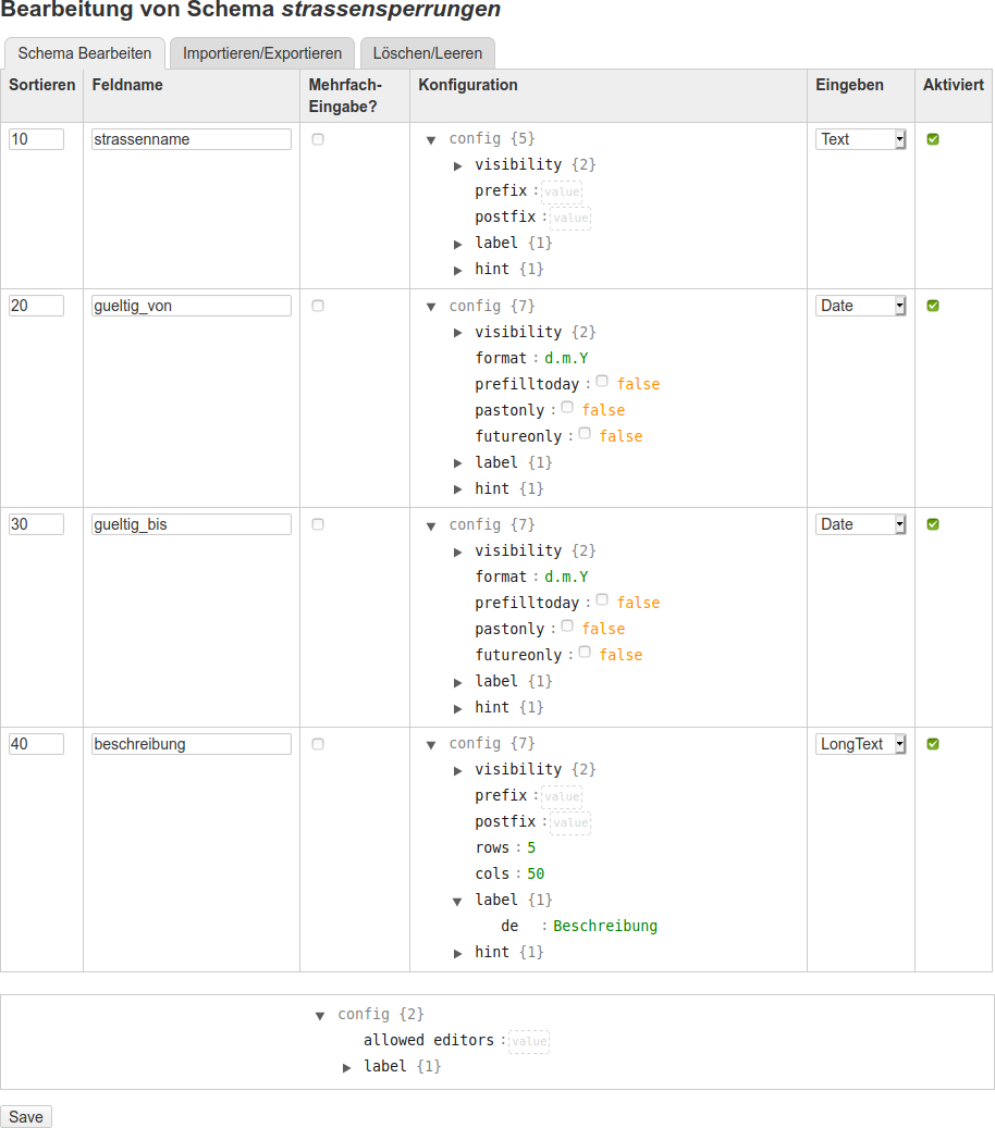 Klicken Sie nun auf Speichern, um das Schema anzulegen. Im nächsten Schritt definieren Sie die Feldnamen (Spaltennamen). Wir definieren hier die Felder strassenname, gueltig_von, gueltig_bis und beschreibung.