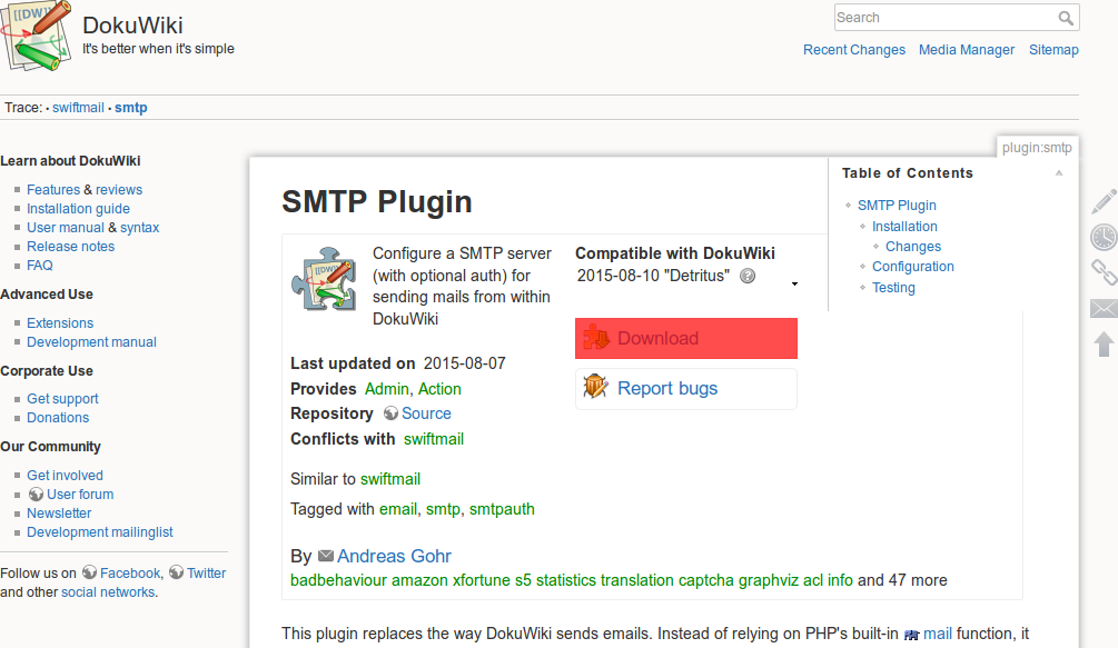 Öffnen Sie auf der Projektseite des DokuWikis die Seite des Plugins, welches Sie installieren möchten. Das SMTP-Plugin finden Sie beispielsweise auf der Seite https://www.dokuwiki.org/plugin:smtp.
